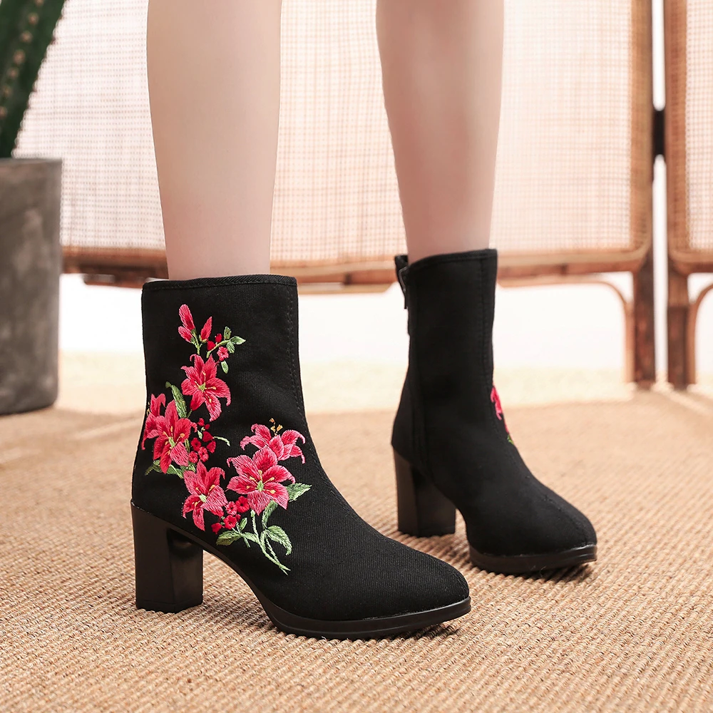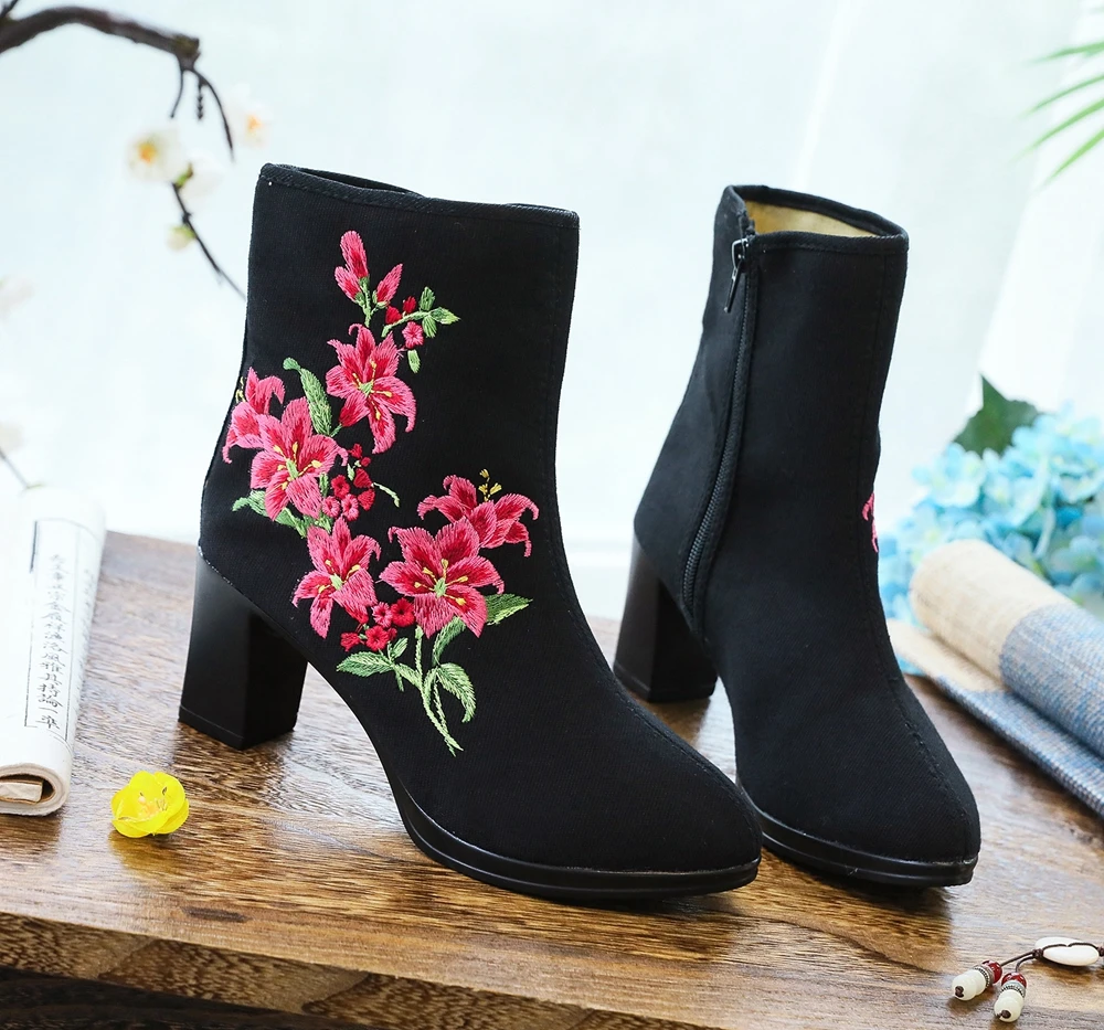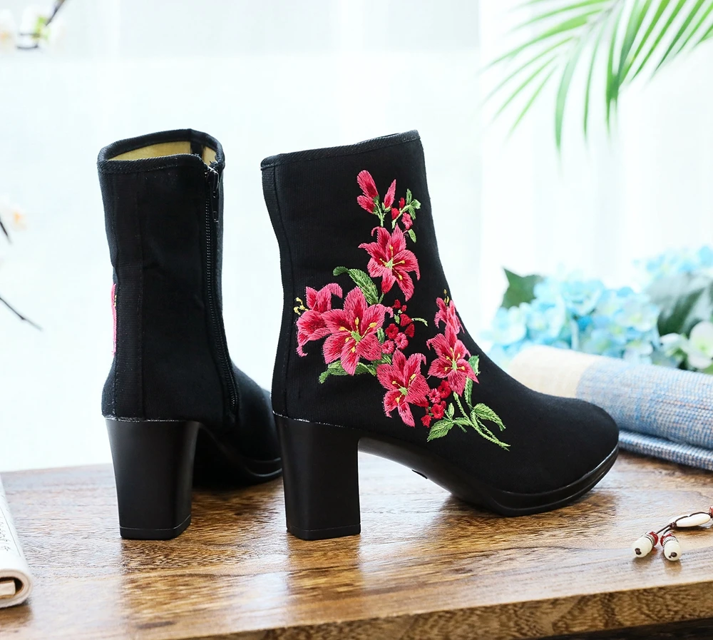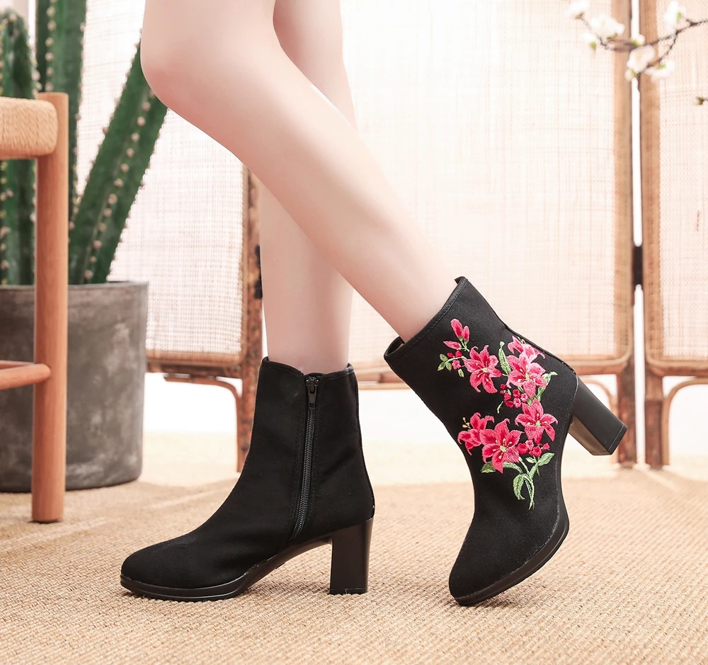 - Ricamo tradizionale e Stile Moderno: Il ricamo richiama le calzature tradizionali cinesi, ma con il design moderno dello stivaletto.Â